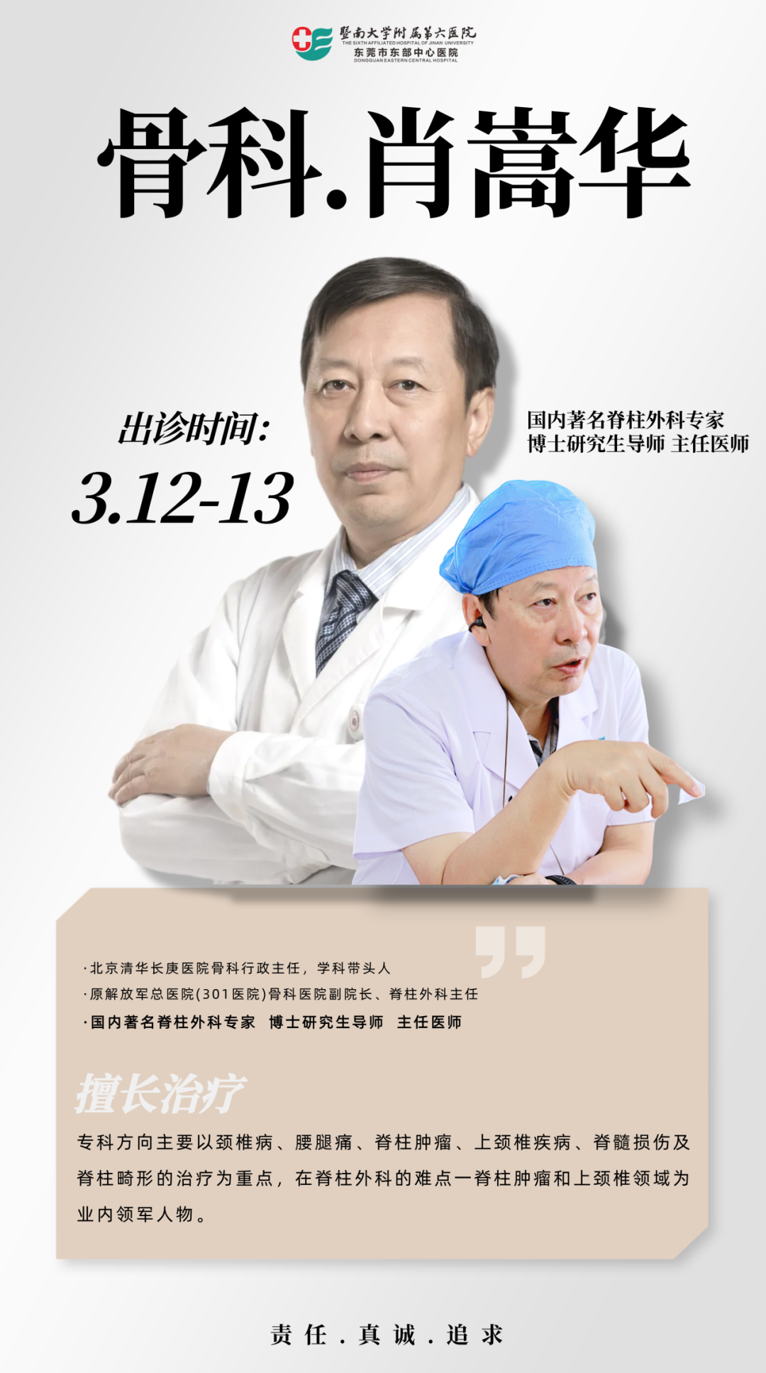 3月12日、13日(下周三、周四),国内脊柱外科顶级专家——清华大学北京清华长庚医院、原解放军总医院(301医院)骨科医院副院长肖嵩华教授,将亲临暨南大学附属第六医院(东莞市东部中心医院)出诊!